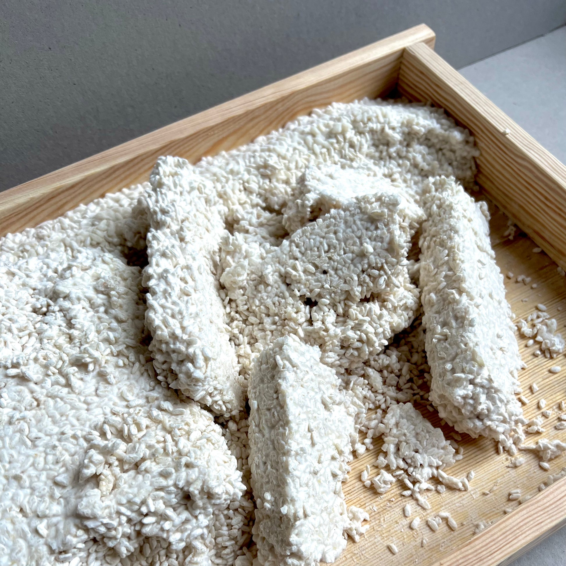 Notre koji de riz est préparé dans la tradition japonaise. Une cuisson contrôlée au milllimètre, et une attention très rigoureuse durant les 2 jours d'inoculation nous permettent d'obtenir un koji de haute qualité.